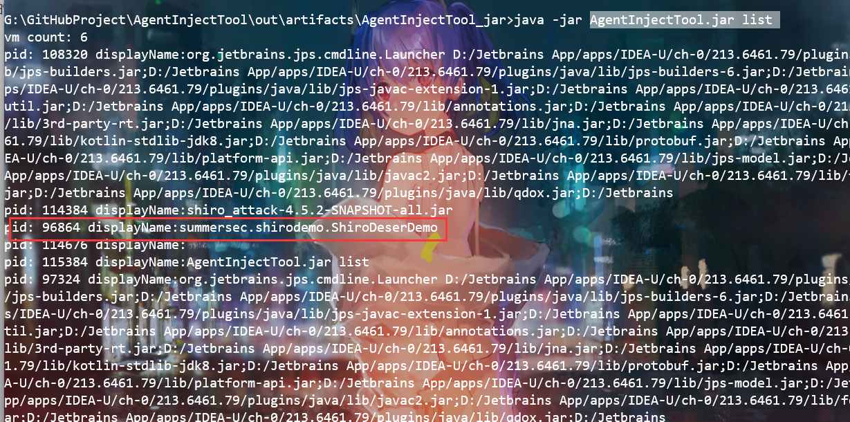 java -jar AgentInjectTool.jar inject {pid} {file.txt|shirokey}