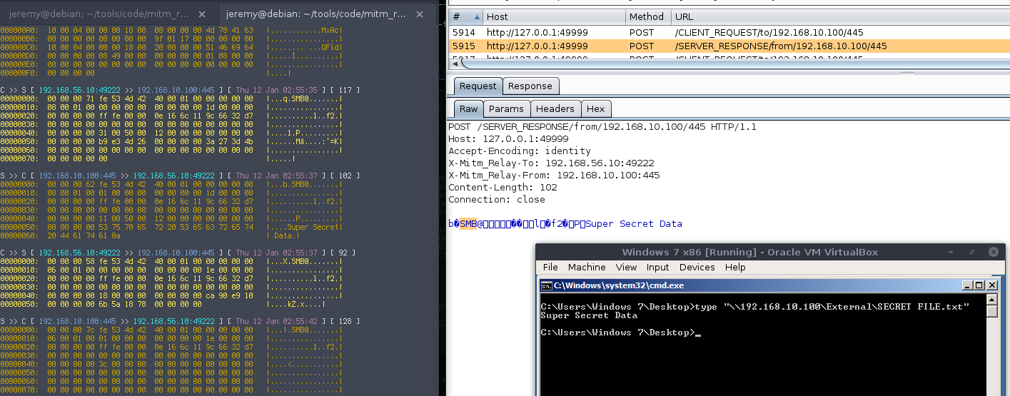 This demo shows an SSH session relayed through mitm_relay + Burp. This is pretty useless as it's SSH anyway and can't be altered (except maybe the initial handshake and list of ciphers), but it shows how you can work with binary protocols.